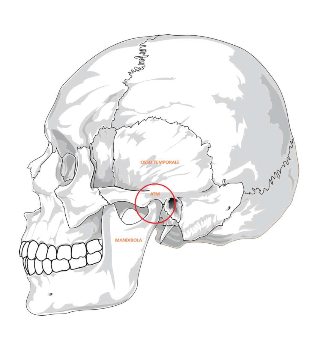 L’articolazione temporo-mandibolare (ATM) è una delle più complesse del corpo umano. Collega la mandibola (osso mascellare inferiore) al cranio, precisamente all’osso temporale, e consente i movimenti della bocca: apertura, chiusura, lateralizzazione, protrusione e retrusione.